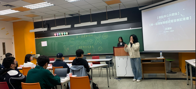 政大運動產業與文化學士學位學程(SportX運動學程)113學年度第1學期開設「運動與公共關係」課程,12月11日首度舉辦「模擬記者會」,以「第一屆運動學程成果發表」為主題。記者會流程與內容全由修課學生企劃發想、分組執行。多位運動學程學生在會中分享學習成果,並將夢想投入「時光膠囊」!